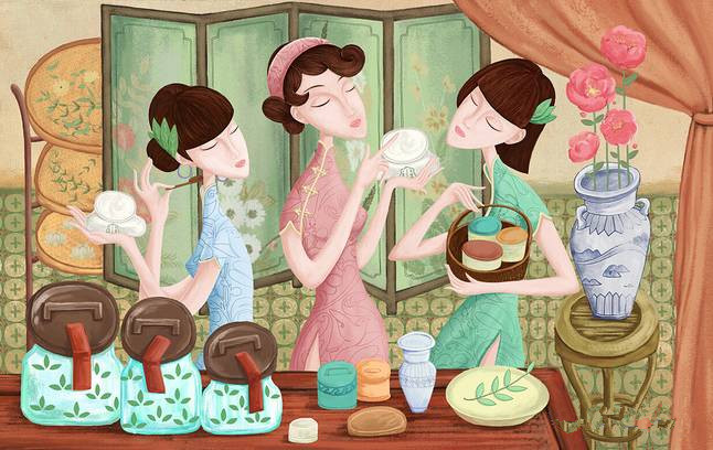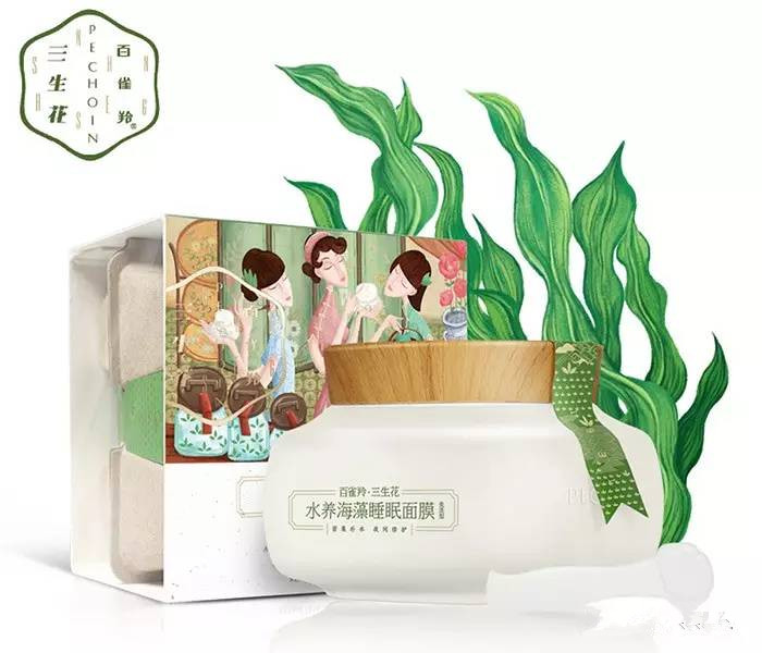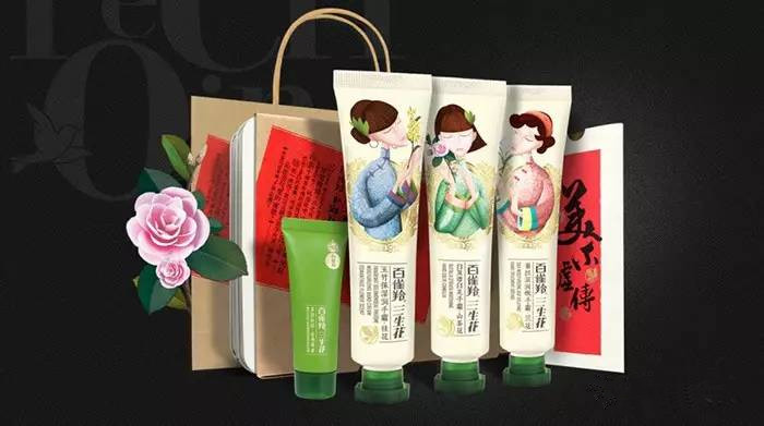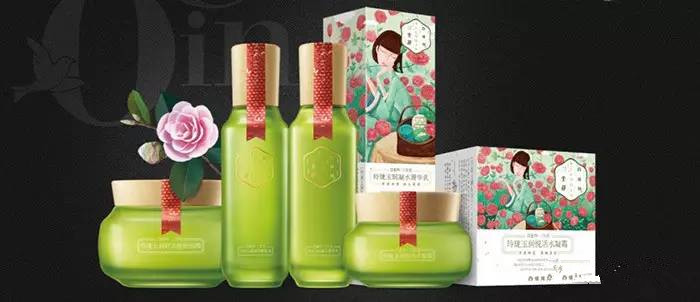 2012年,百雀羚旗下還有一款名為“百雀羚·三生花”的子品牌,延續(xù)了品牌一貫“東方美學”的理念,化妝品包裝上的三個插畫形象分別代表了三種珍貴的護膚草本植物:三色堇、山茶花、金釵石斛。畫面里是貓咪一樣迷之傲嬌+優(yōu)雅的美人。想當初小編開始用面膜,在購買面膜的時候就是因為看上了百雀羚的這化妝品盒才成為了它的粉,當然,現在也還在用。