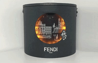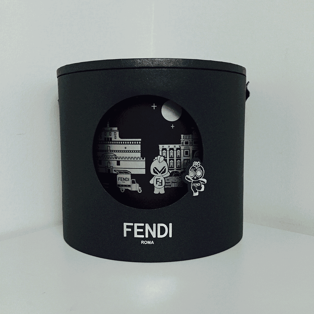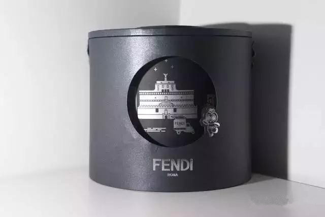 Fendi的月餅盒子大型且別致,是圓柱形,外面站了一個(gè)Fendi小怪獸,寫(xiě)著“Fendi 羅馬”。