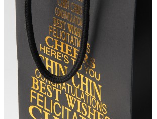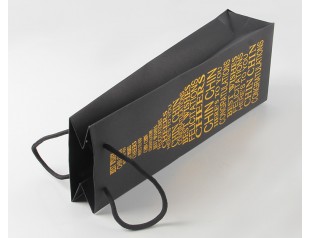 這款紅酒禮品紙袋選用的材質(zhì)是雙銅紙,采用專色印刷工藝將袋身印刷成黑色,覆啞膜,袋子表面的文字則采用燙金工藝;