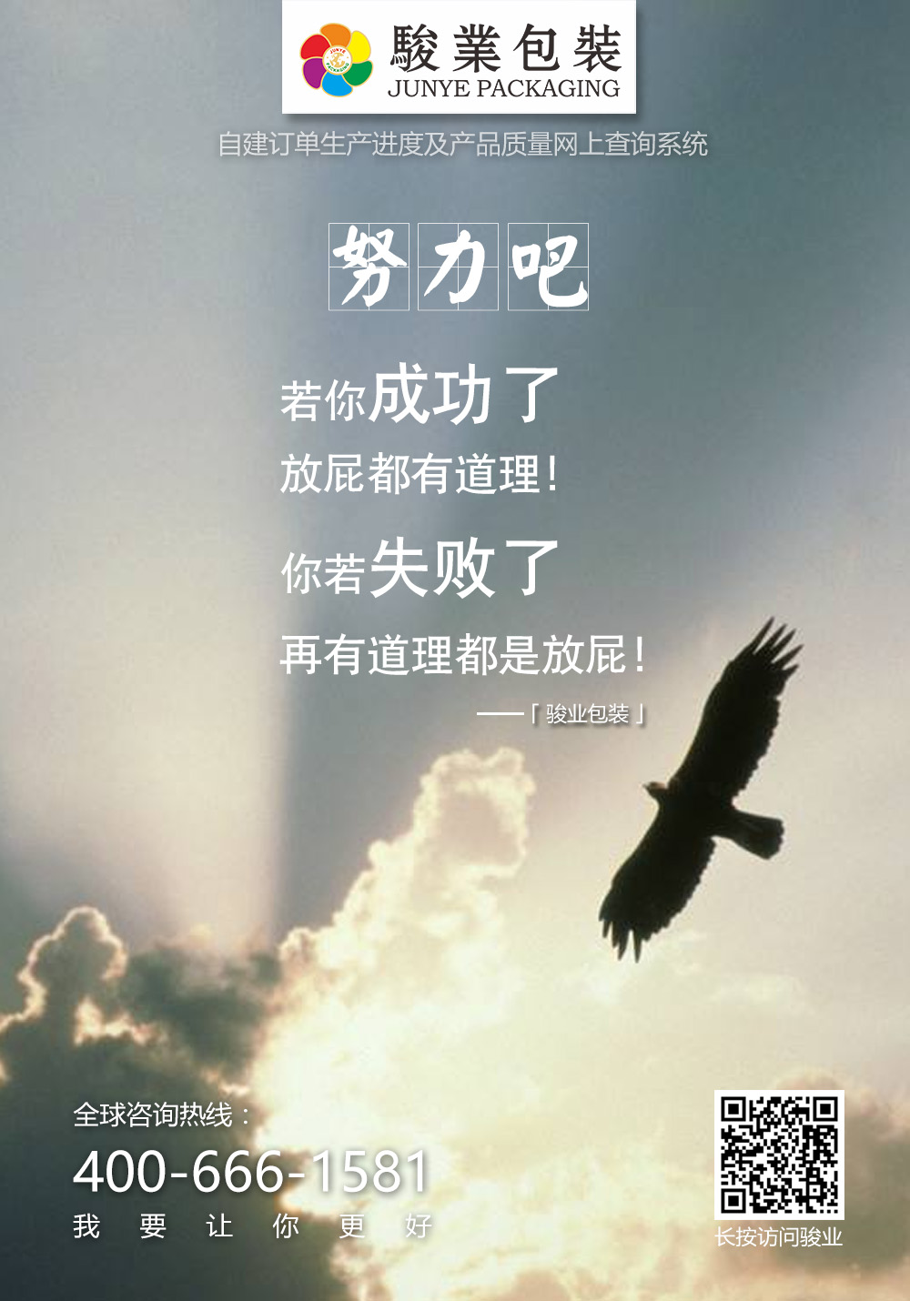 都說成年人的世界里從來沒有容易二字,在這個鋼筋水泥森林里,我們就像一個沒有根的蒲公英在這個城市里飄著,搖擺不定的生活,人來人往,我們每天接觸到各種不同的人,被不同的“氣場”給包圍著,其實人很容易被周圍的事物影響,或許在來上班的路上剛好聽到一個人在抱怨生活,那么可能你也會覺得生活不易,從而一整天郁郁寡歡,所以為了不讓駿業(yè)包裝的小伙伴們帶著負能量工作,駿業(yè)包裝的小張為大家每天準備了一點正能量的雞湯,不用客氣,大家一起來干了這篇雞湯吧!