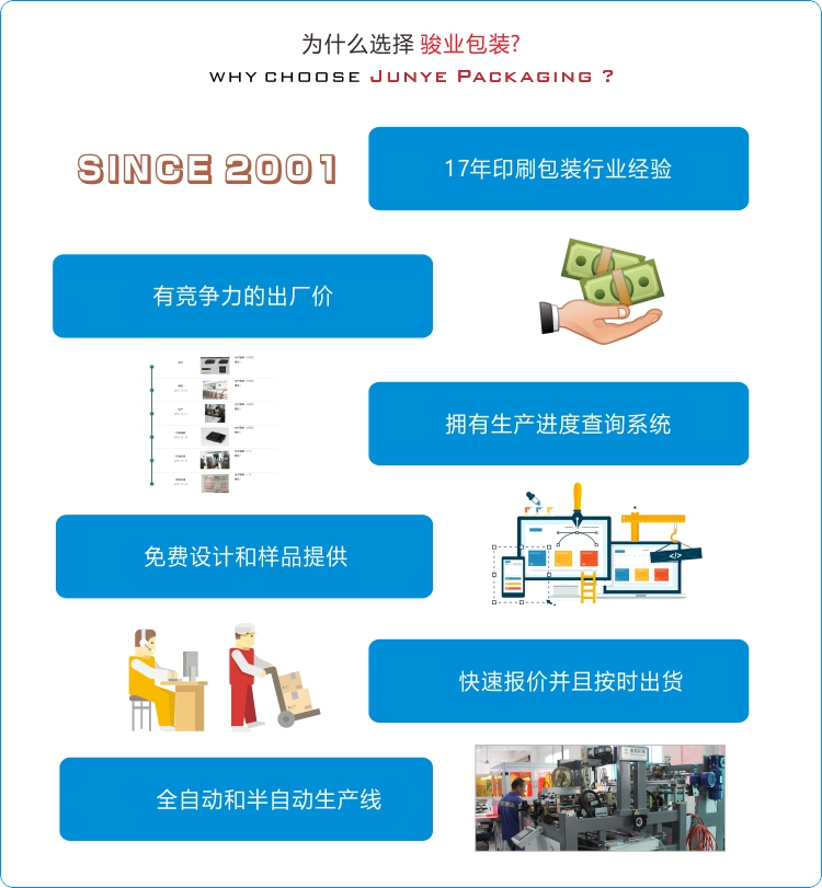 廣州駿業(yè)包裝實(shí)業(yè)有限公司創(chuàng)建于 2001年,是一家以印刷包裝制品為主營(yíng)業(yè)務(wù)的集設(shè)計(jì)、生產(chǎn)、銷售為一體的一般納稅企業(yè),主要生產(chǎn)各種精品包裝盒、紙袋、吊牌,其主要應(yīng)用于服飾、皮具、化妝品、保健品、禮品、首飾、茶葉、酒類、電子產(chǎn)品及其它日用制品等行業(yè),并通過(guò)了德國(guó)萊茵認(rèn)證、BV認(rèn)證、SGS認(rèn)證和WCA認(rèn)證.