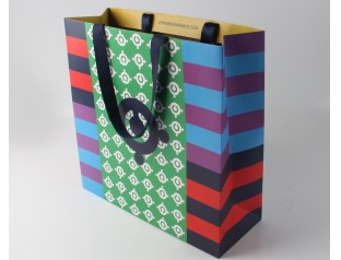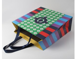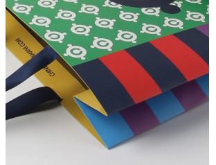 此款手挽紙袋采用250克單銅紙四色印刷過啞膠,不打孔粘扁繩。小清新條紋手提紙袋,環(huán)保美觀、精致耐用。深藍色的絲帶作為手提紙袋的手提繩,高檔大方。想了解更多的手提紙袋,歡迎致電廣州駿業(yè)包裝廠